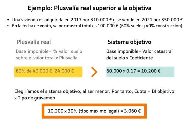 - La plusvalía real, calculada en base a la diferencia entre el valor de adquisición del terreno y el valor de venta.